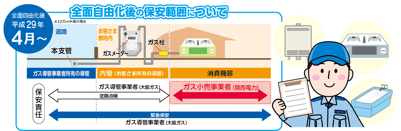 2017年4月1日から家庭分野を含めたガス小売り全面自由化スタートし、それに伴い、これまでガス導管事業者(大阪ガス)が実施していました調査業務の範囲をお客さま宅内のガス栓を境にガス導管事業者(大阪ガス)とガス小売り事業者(関西電力等)で保安責任を分担して実施することになりました。